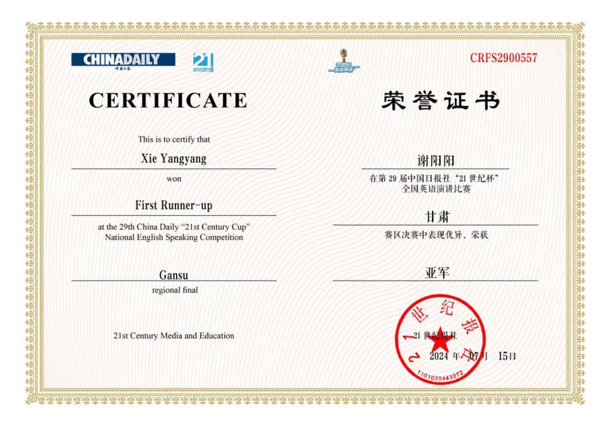 近日,第29届中国日报社“21世纪杯”全国英语演讲比赛地区决赛(暨甘肃省赛)圆满落幕。公司zoty中欧英语专业本科生谢阳阳在此次比赛中表现出色,荣获亚军,晋级全国半决赛。俄语专业本科生王艺霖同学荣获三等奖。